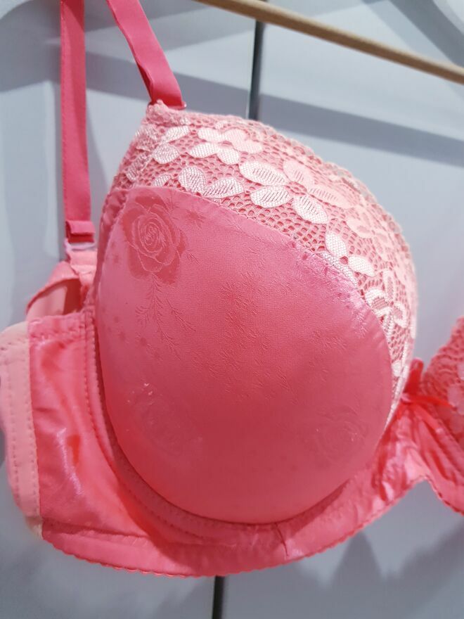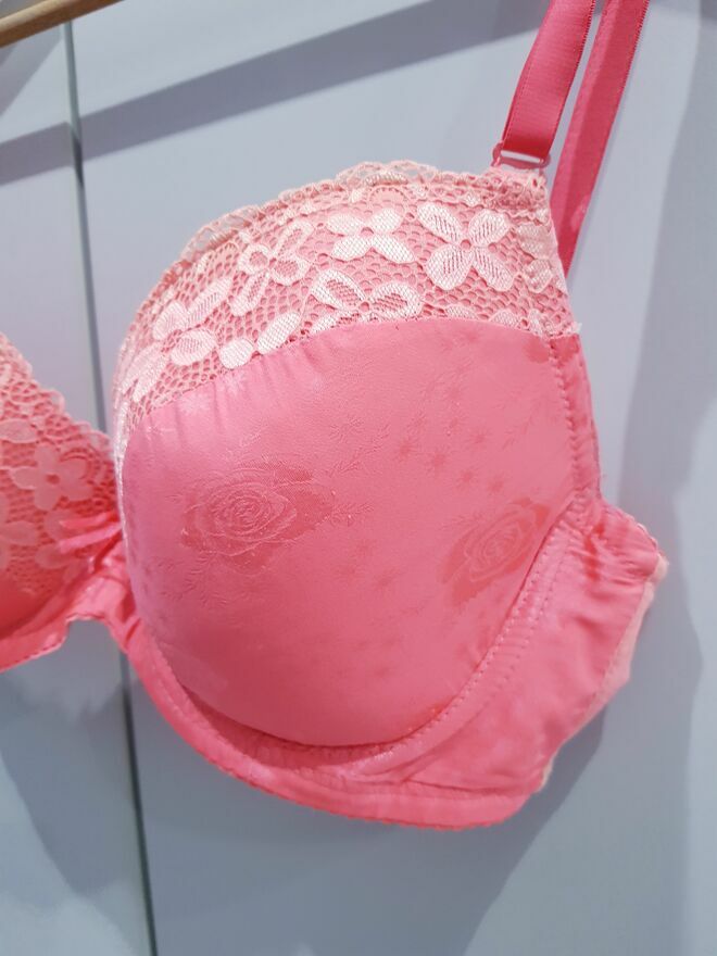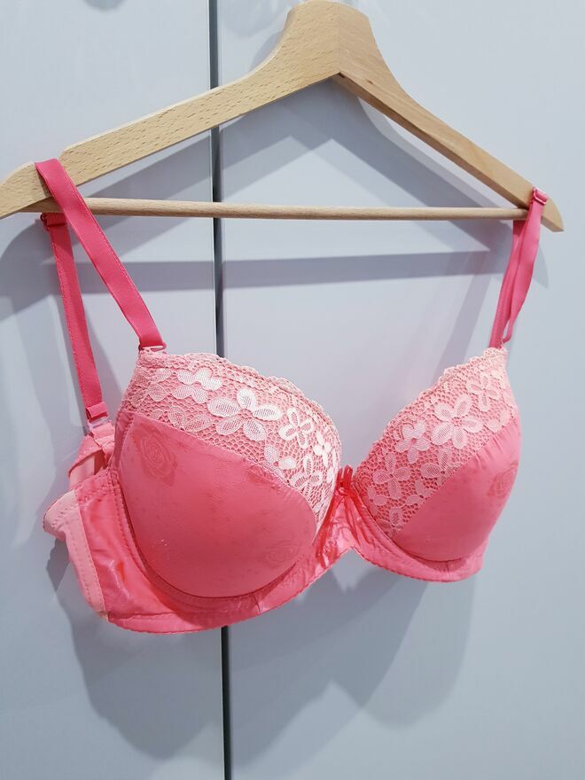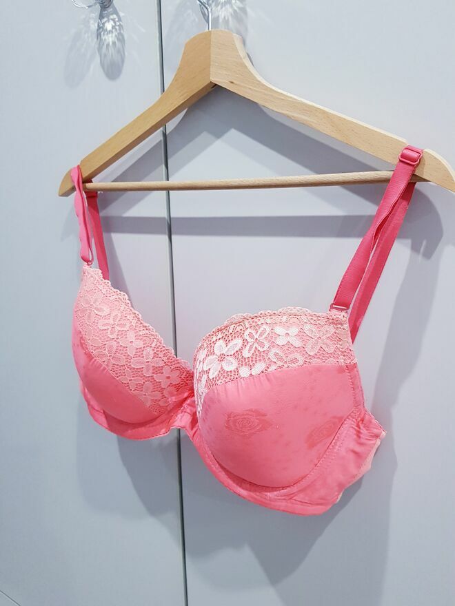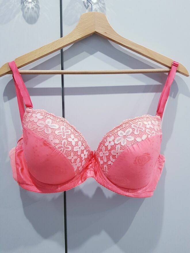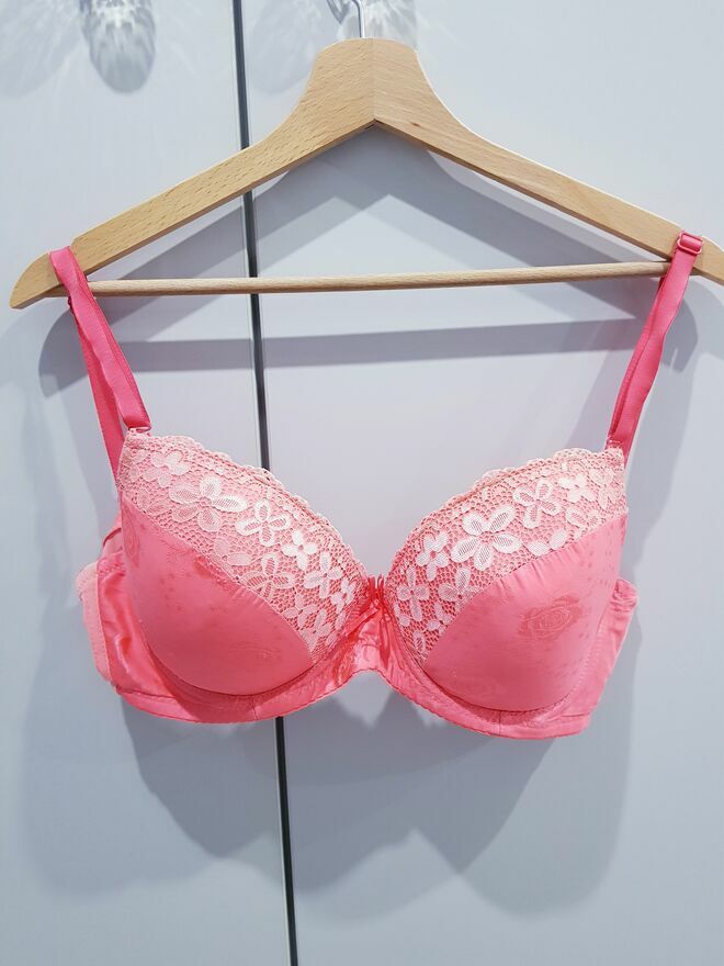 Przedmiotem sprzedaży jest damski biustonosz w jasnym kolorze pomarańczu (taki lekki neonek).Biustonosz prosty z deliktnym zdobieniem na miseczkach w postaci koronki i wytłoczonych róż. Biustonosz na odpinanych oraz regulowanych ramiączkach. Miseczki biustonosza posiadają delikatne wypelnienie.