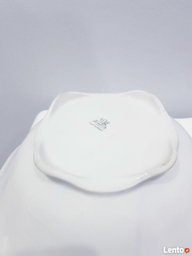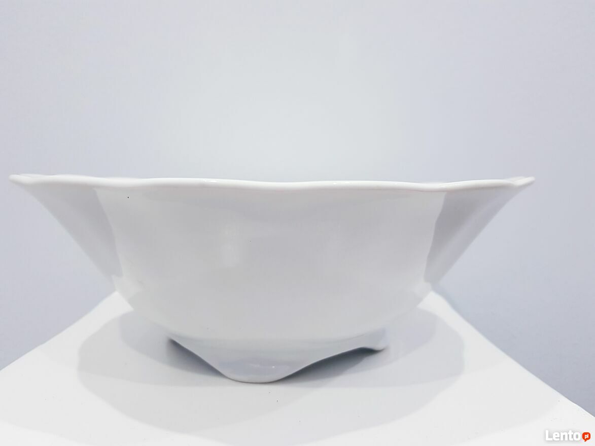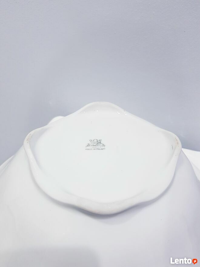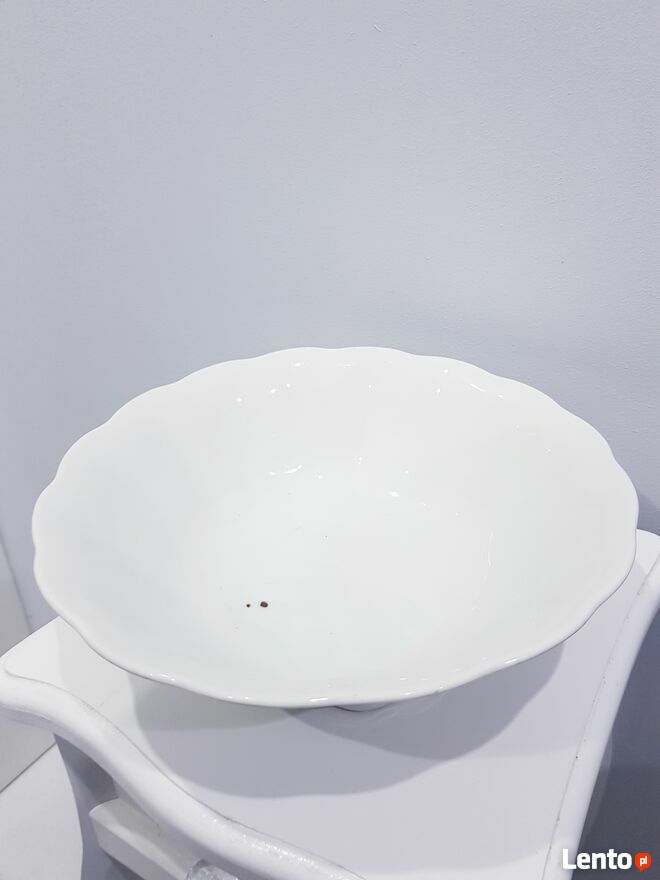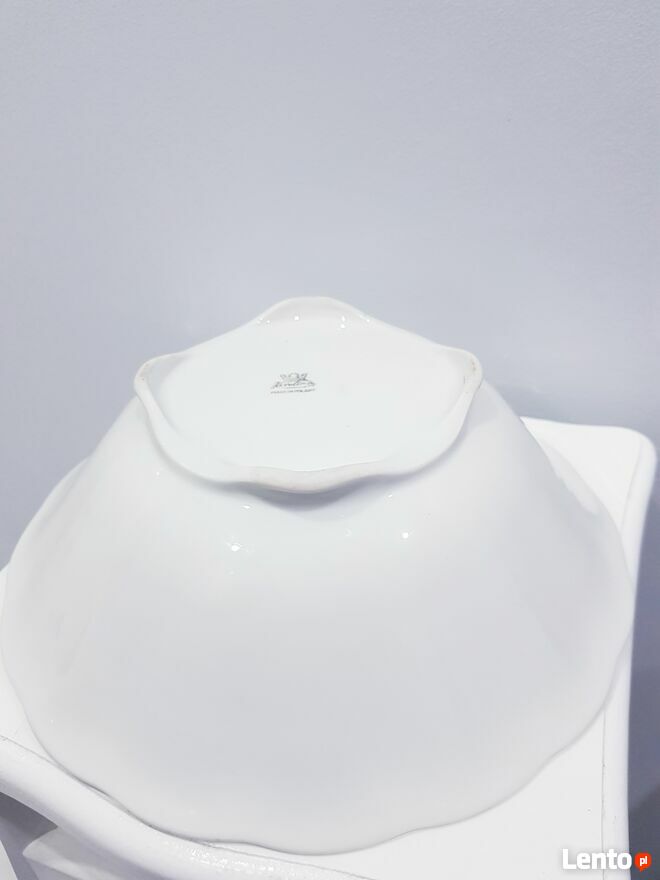 Przedmiotem sprzedaży jest stara porcelanowa misa w białym kolorze. Misa wykonana z polskiej porcelany przez nieistniejące już Zakłady Porcelany Stołowej "Karolina" w Jaworzynie Śląskiej.Misa okrągła ale posiada dość ciekawy dół, który jest kwadratowy. Po zewnętrznej stronie posiada delikatnie wypukłe zdobienia. Bez pęknięć i uszczerbień. Jedynym mankamentem są dwie małe czarne kropki wewnątrz misy (widoczne na zdjęciach). Jednakże nie przeszkadza to w dalszym użytkowaniu.