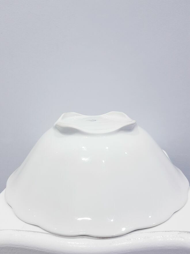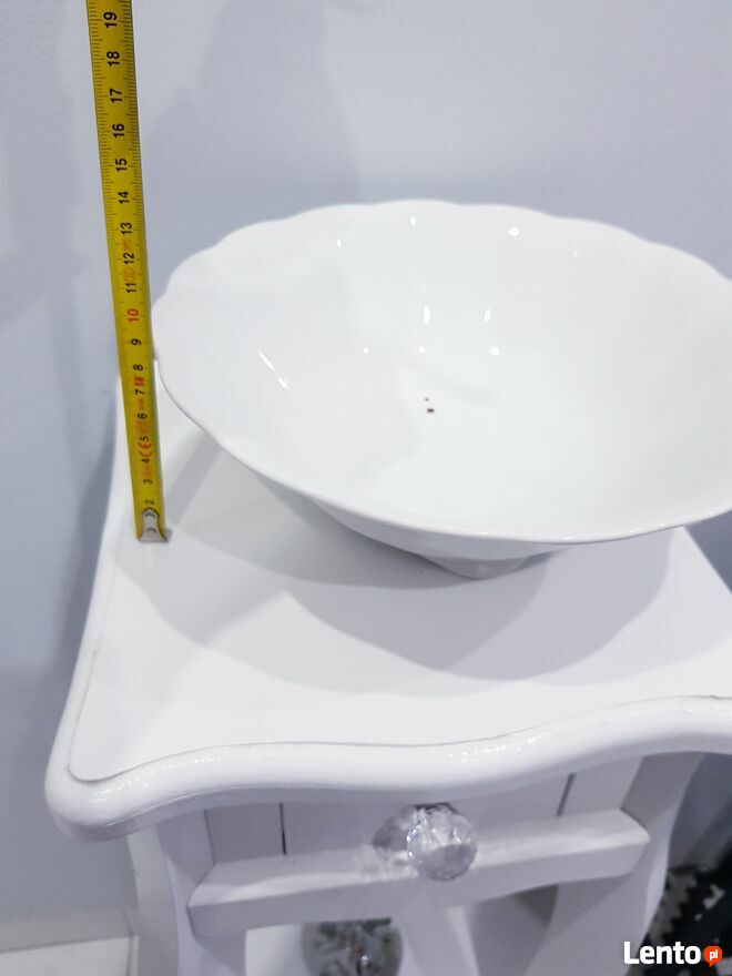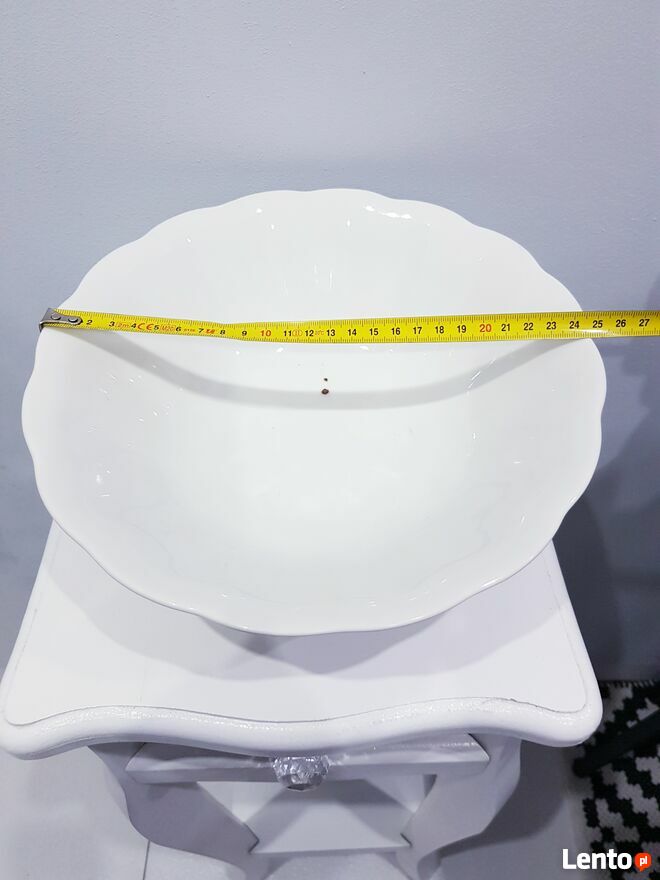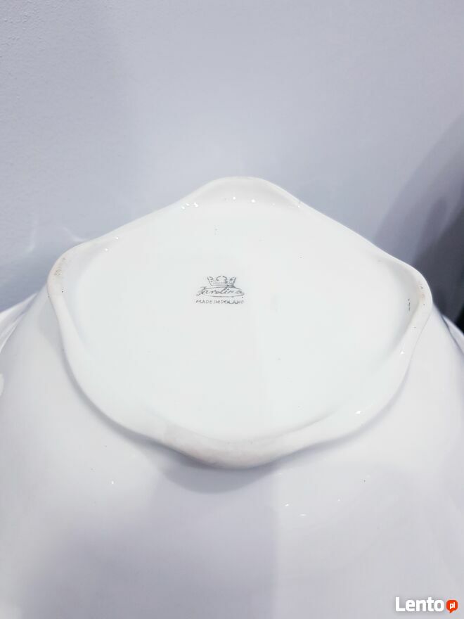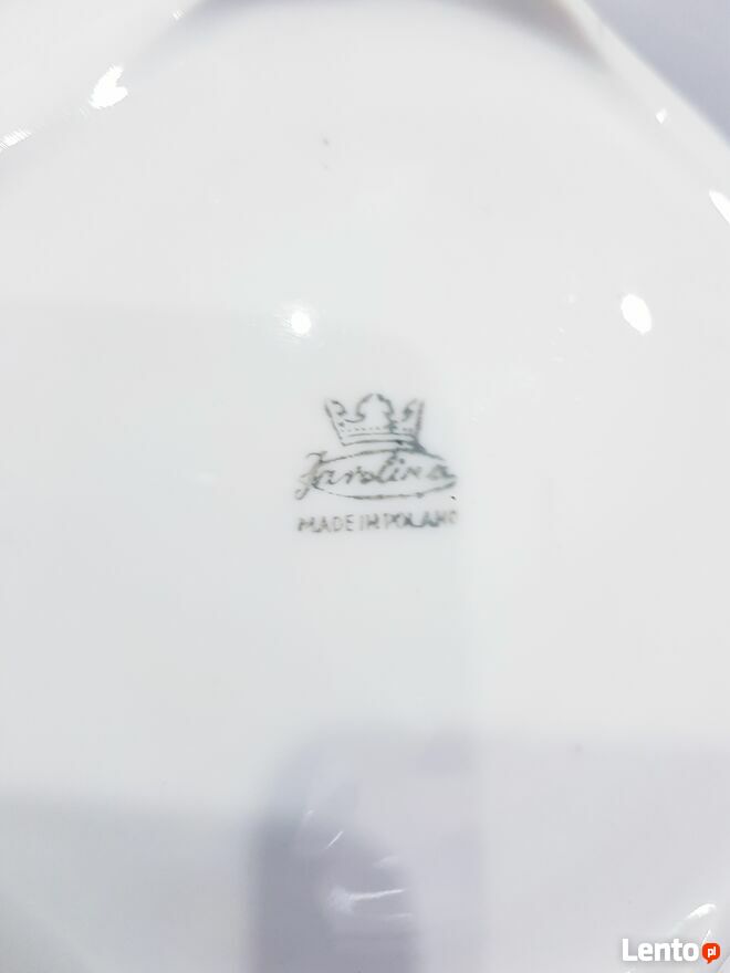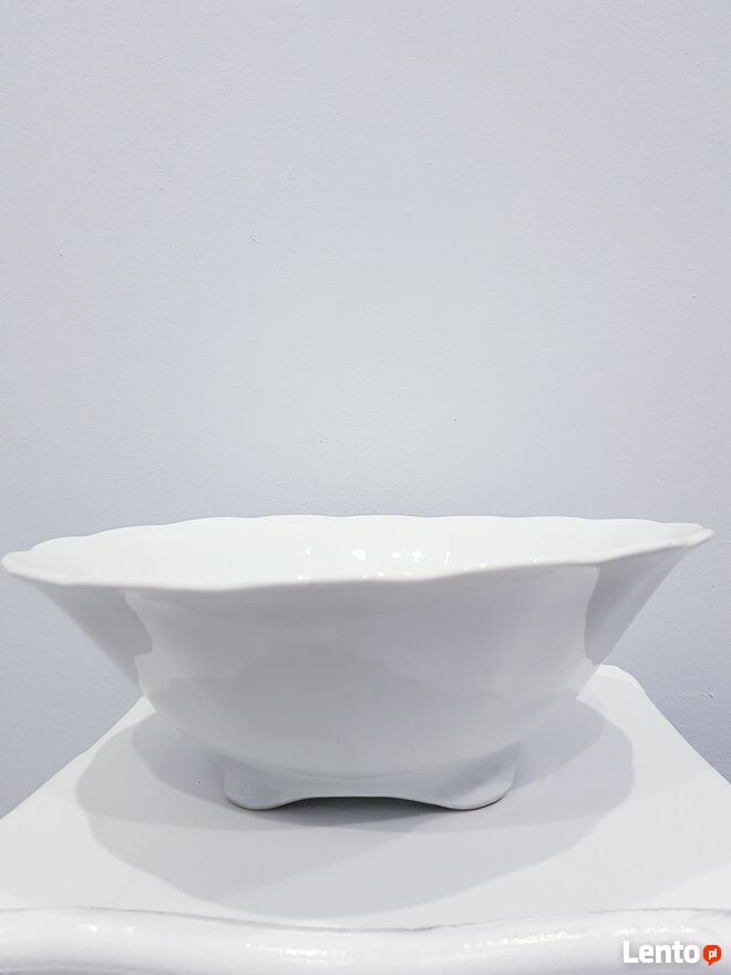 Przedmiotem sprzedaży jest stara porcelanowa misa w białym kolorze. Misa wykonana z polskiej porcelany przez nieistniejące już Zakłady Porcelany Stołowej "Karolina" w Jaworzynie Śląskiej.Misa okrągła ale posiada dość ciekawy dół, który jest kwadratowy. Po zewnętrznej stronie posiada delikatnie wypukłe zdobienia. Bez pęknięć i uszczerbień. Jedynym mankamentem są dwie małe czarne kropki wewnątrz misy (widoczne na zdjęciach). Jednakże nie przeszkadza to w dalszym użytkowaniu.