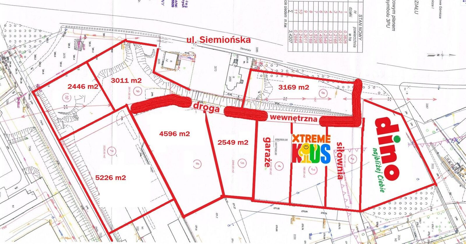 Działki o powierzchni od 2446 do 22 000 m2.Działka usługowa, uzbrojona, w trakcie podziału i karczowania, przygotowywania dla inwestora, prawa do użytkowania wieczystego, w połowie już zarezerwowana przez sieć spożywczą, siłownię, park zabaw dla dzieci, zespół garaży.