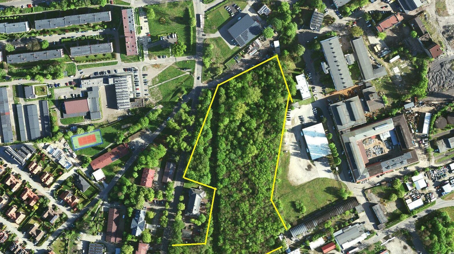 Działka usługowa, uzbrojona, w trakcie podziału i karczowania, przygotowywania dla inwestora, prawa do użytkowania wieczystego, w połowie już zarezerwowana przez sieć spożywczą, siłownię, park zabaw dla dzieci, zespół garaży.