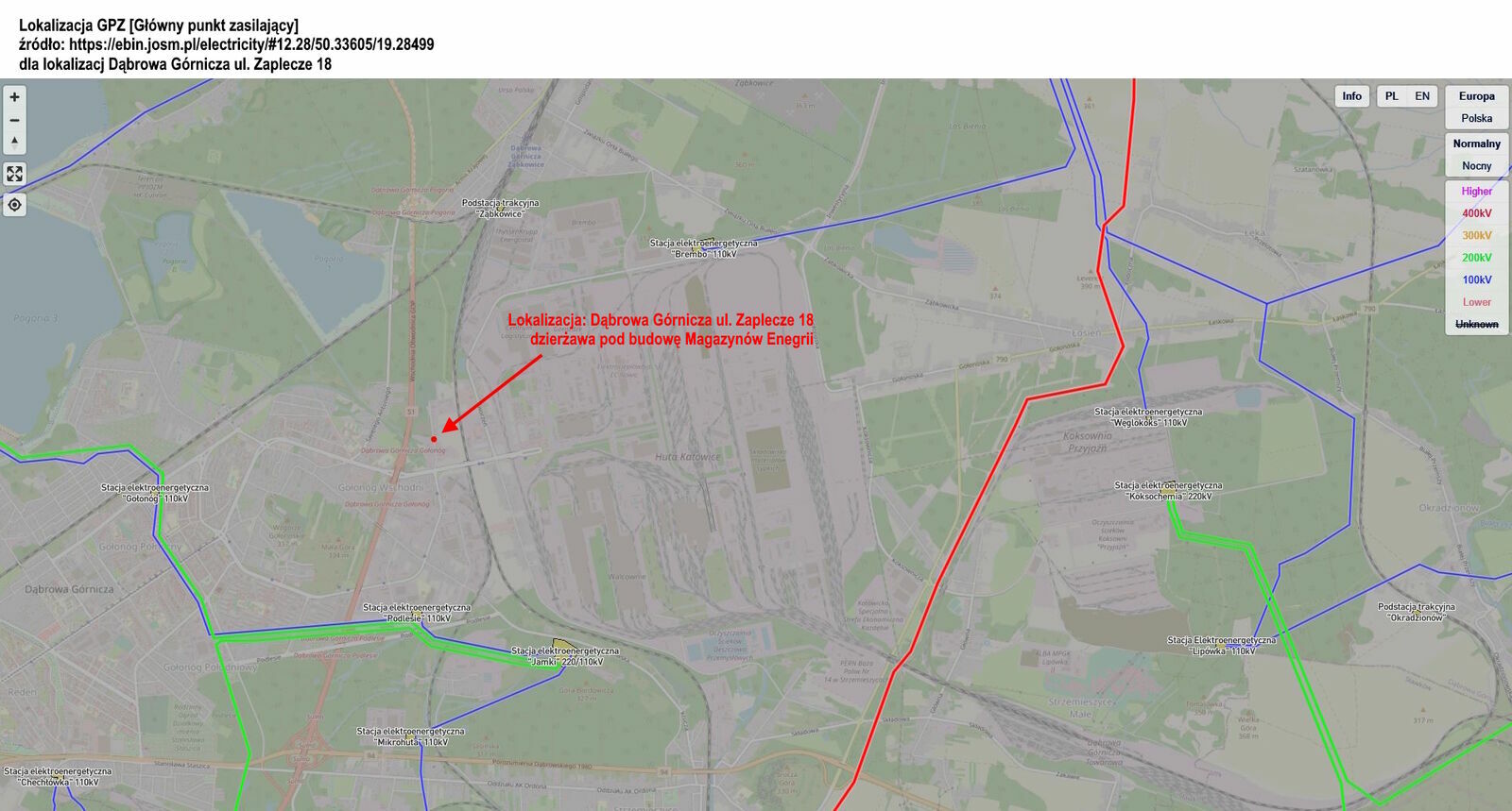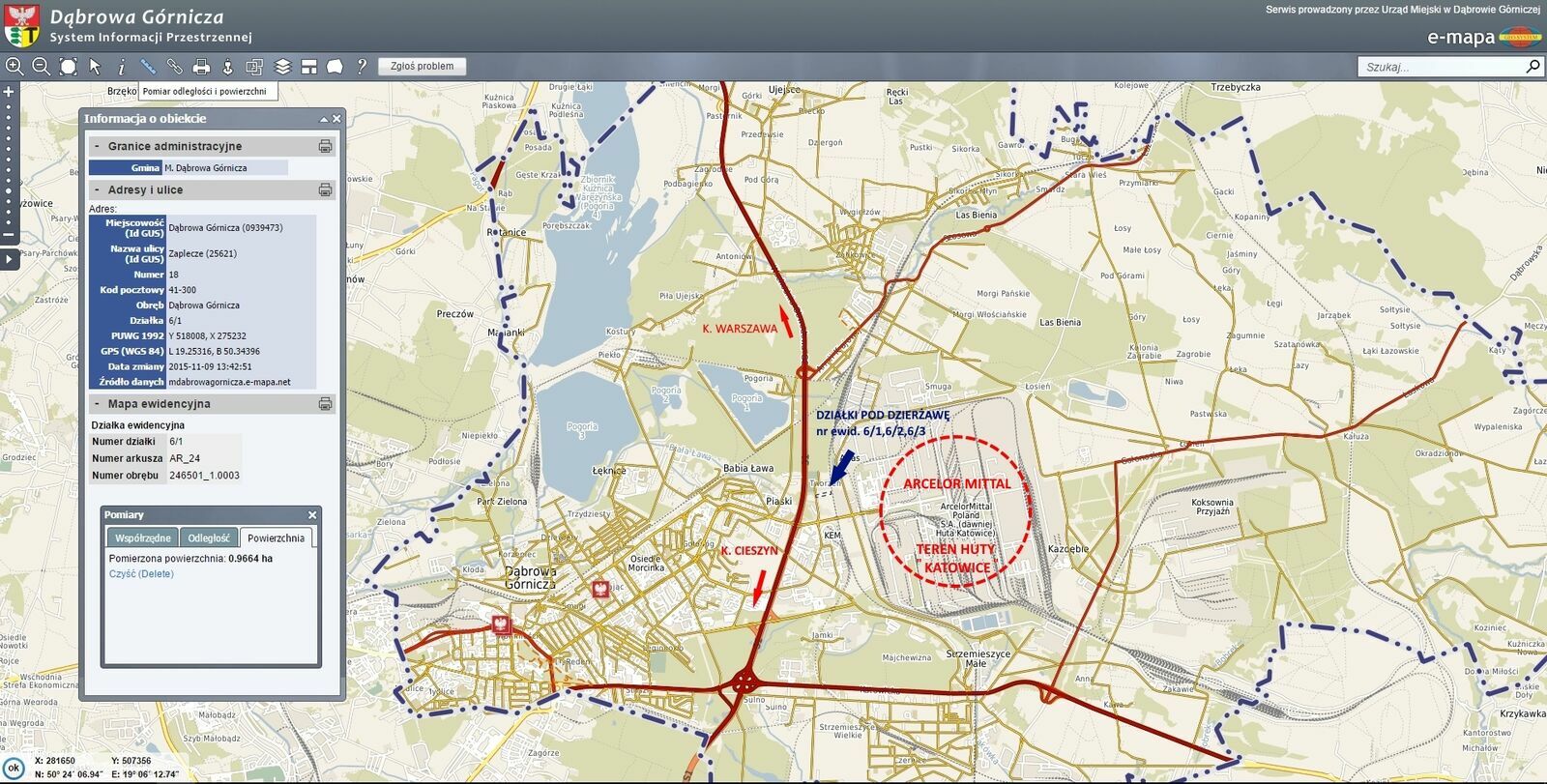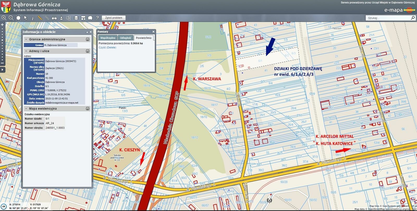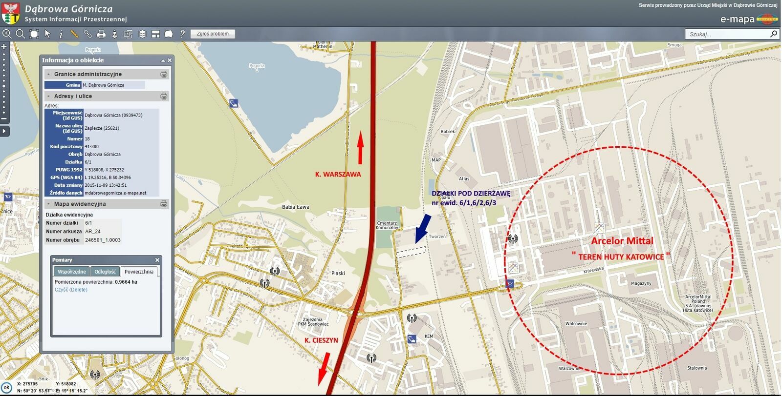 Przedmiotem oferty jest dzierżawa nieruchomości gruntowej położonej w mieście Dąbrowa Górnicza, w skład której wchodzą działki o łącznej powierzchni 9719,0 m2. Działki nie są obciążone hipoteką. Idealna lokalizacja pod budowę ME Magazynów Energii z bliskim dostępem do "GPZ" jak również bazę przeładunkową, magazyn. Tereny o oznaczeniu jako zabudowy produkcyjnej, składów i magazynów.Ww. teren posiada bezpośredni dostęp do drogi asfaltowanej z wyznaczoną lokalizacją zjazdu. Nawierzchnia jezdni wraz infrastrukturą podziemną wykonana w latach 2007/2010. W drodze poprowadzone media z możliwością wykonania indywidualnych przyłączy: wody bytowej, kanalizacji sanitarnej, kanalizacji deszczowej, energii elektrycznej oraz kanalizacji teletechnicznej. W odległości 600m przebiega droga ekspresowa E75 będąca trasą europejską północ- południe, biegnąca z Norwegii przez Finlandię, Polskę, Czechy, Słowację, Węgry, Serbię, Macedonię aż do Grecji. Dojazd do tej drogi jest w pełni przystosowany do transportu kołowego pojazdami wielkogabarytowymi typu ciężkiego. W odległości 1,0km znajduję się główna brama wjazdowa na teren koncernu Arcelor Mittal będącego największym producentem stali na świecie – dawniej Huta Katowice. Dzięki takim aspektom teren ten niewątpliwie zyskuje na swojej atrakcyjności.