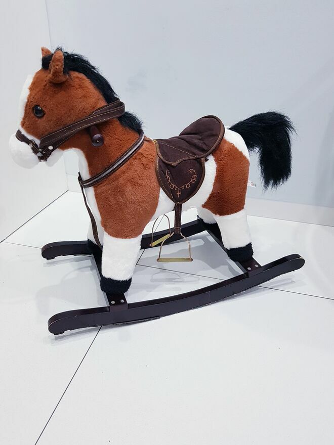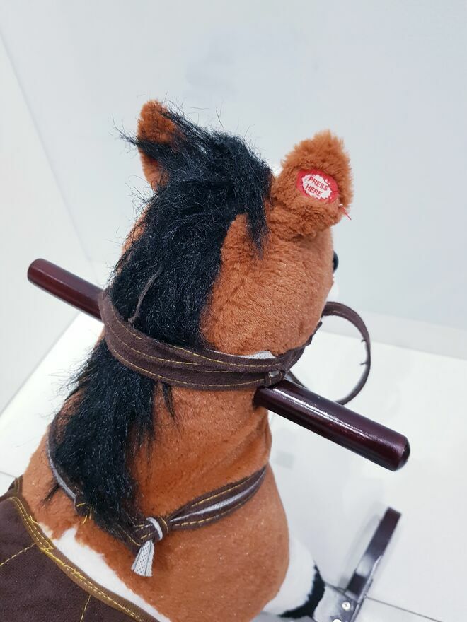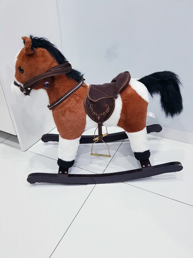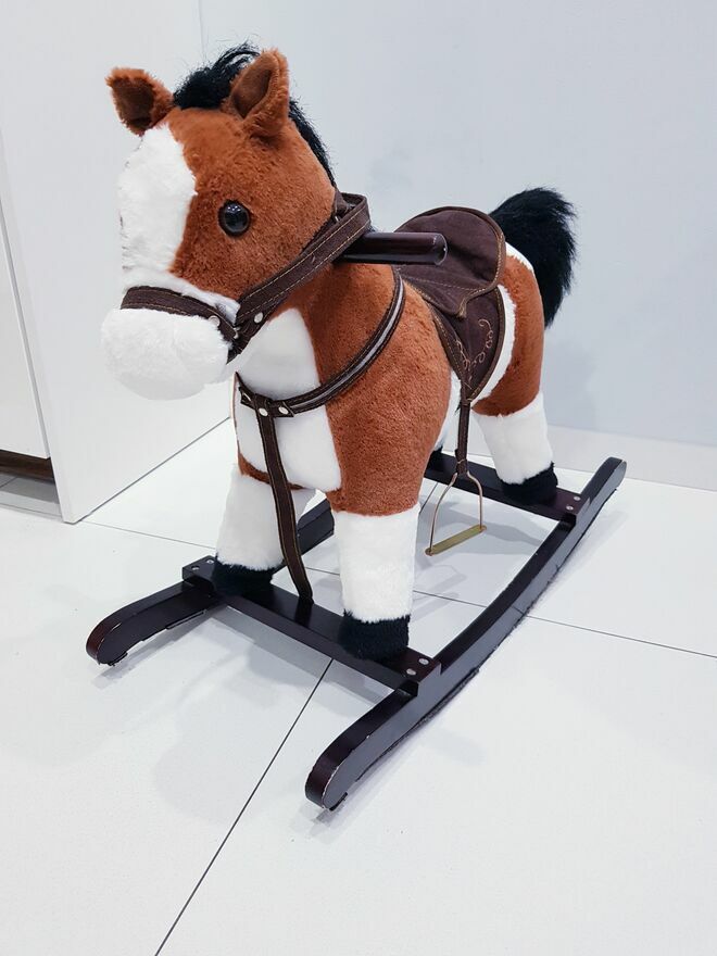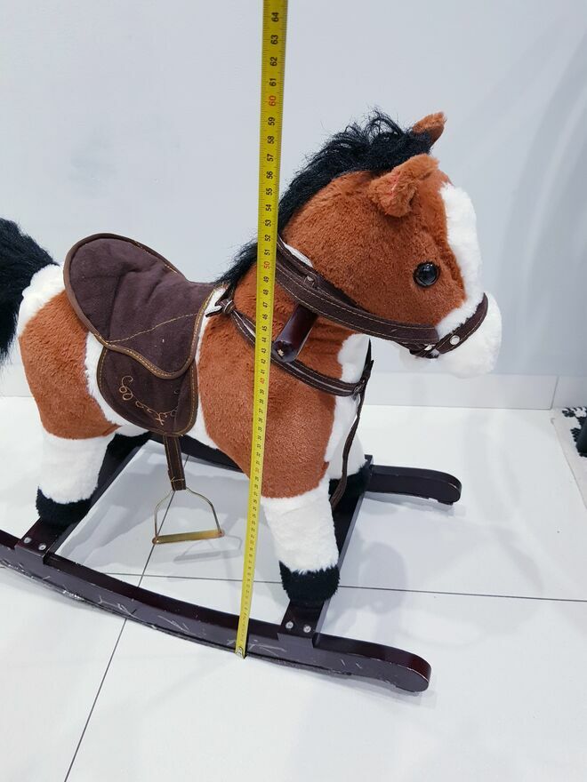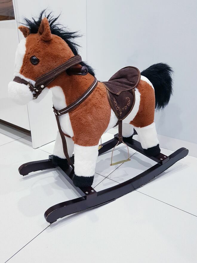 Przedmiotem sprzedaży jest koń na biegunach z ruchomym ogonem i efektami dźwiękowymi. Koń w ciemnym czekoladowym kolorze z białymi łatkami łatkami. Dzięki wielu detalom takim jak: siodło, strzemiona czy wodze-zabawa przeniesie dziecko w świat dzikiego zachodu, czy też zawodów konnych i sprawi wiele radości małym fanom jazdy konnej. Zabawka nie dość, że pełni funkcję bujaka to również posiada interaktywne atrakcje. W uszach konia znajdują się ukryte przyciski, które uruchamiają odgłosy galopu oraz rżenia. A także uruchamiają ruchy ogona. Dzięki takim rozwiazaniom, zabawa będzie jeszcze bardziej wciągająca.Drewniane płozy zapewniają stabilność podczas zabawy i bujania. A umieszczone na nich dodatkowe strzemiona zapewniają bezpieczeństwo podczas zabawy. Dodatkowo po obu stronach szyi konia umieszczone są drewniane chwyty, których dziecko może używać podczas bujania.