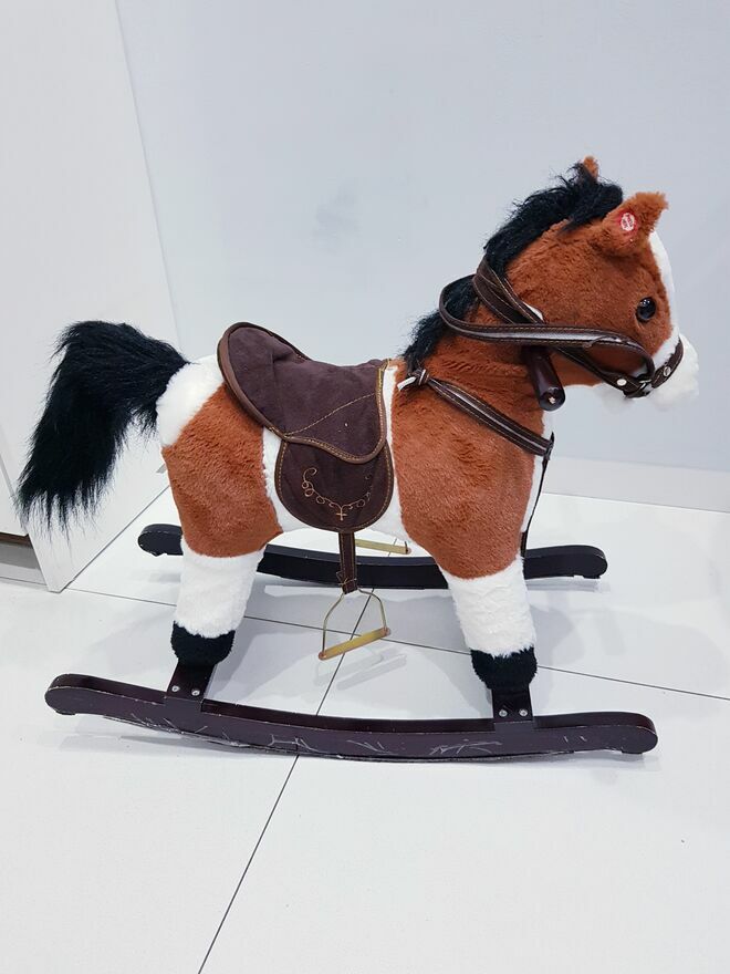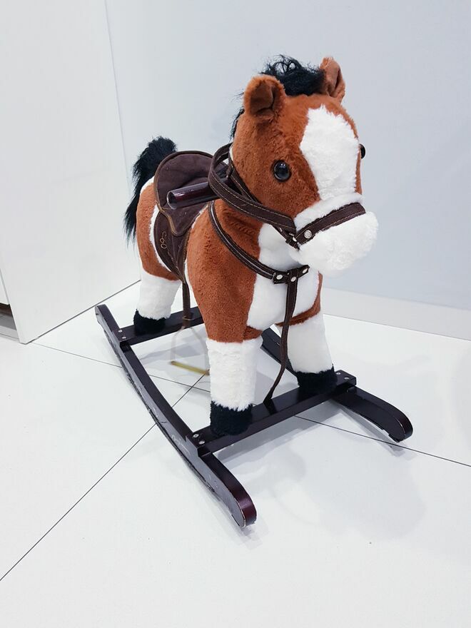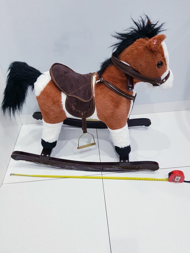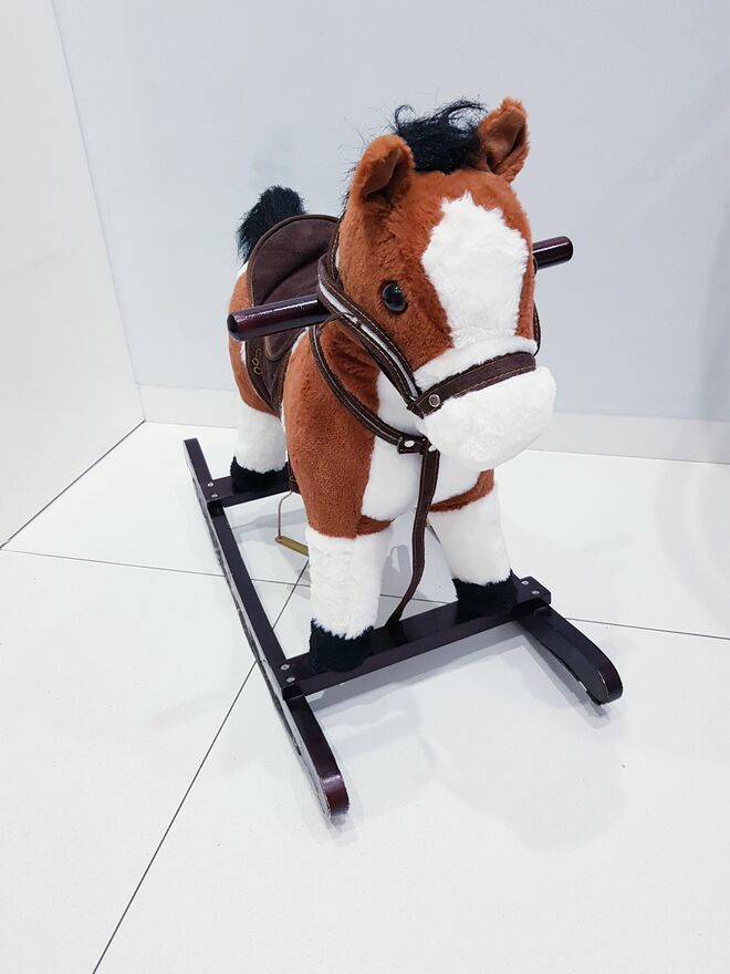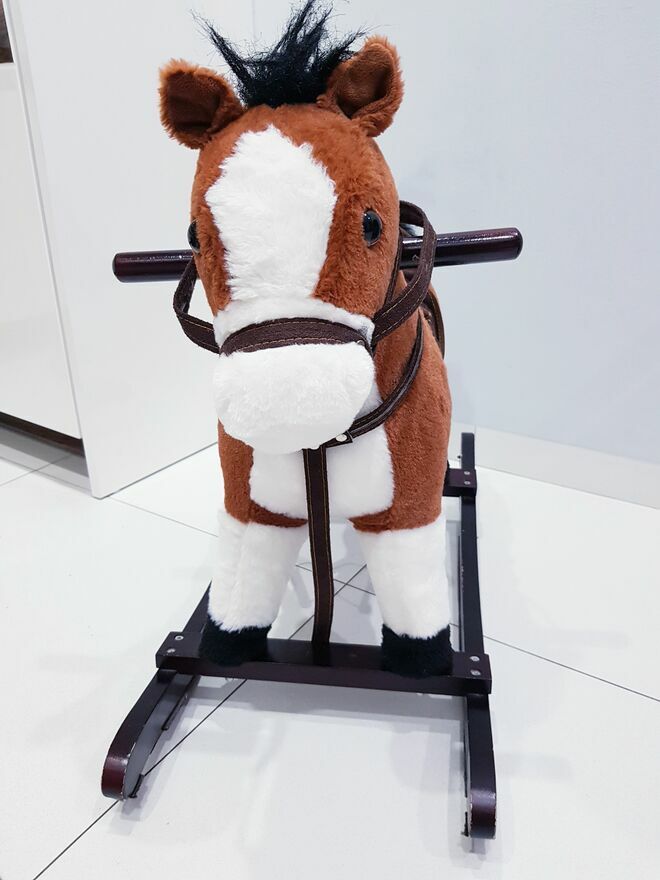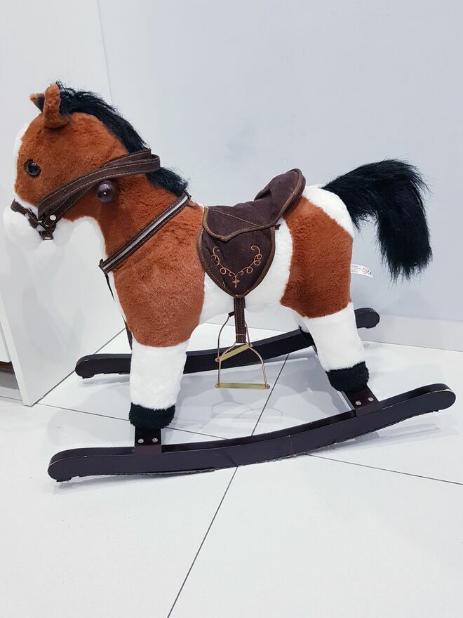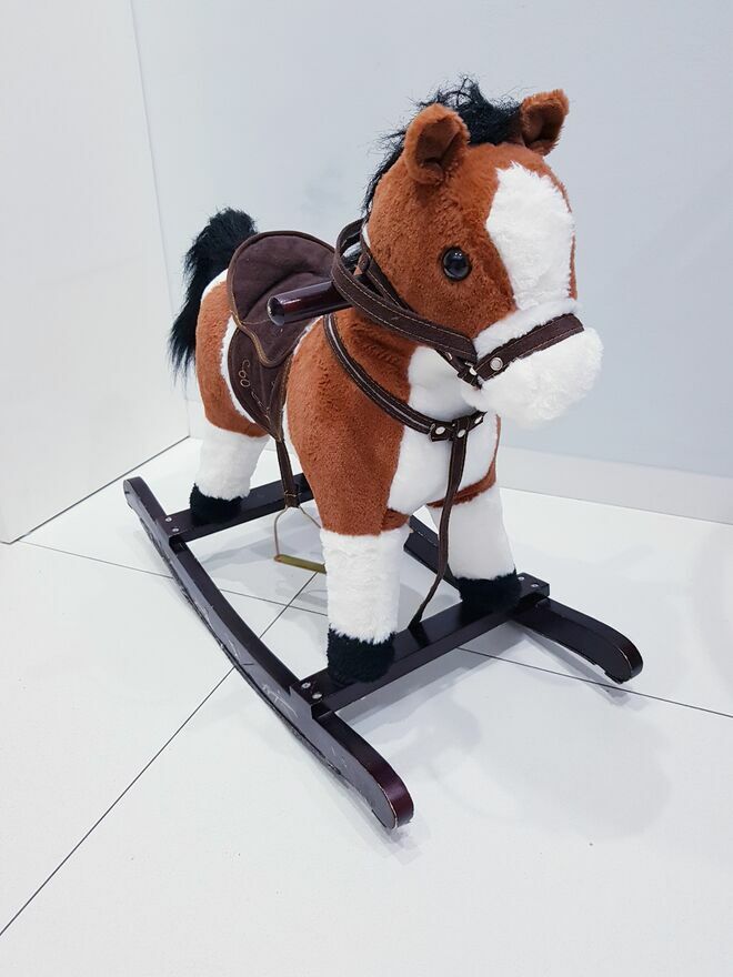 Przedmiotem sprzedaży jest koń na biegunach z ruchomym ogonem i efektami dźwiękowymi. Koń w ciemnym czekoladowym kolorze z białymi łatkami łatkami. Dzięki wielu detalom takim jak: siodło, strzemiona czy wodze-zabawa przeniesie dziecko w świat dzikiego zachodu, czy też zawodów konnych i sprawi wiele radości małym fanom jazdy konnej. Zabawka nie dość, że pełni funkcję bujaka to również posiada interaktywne atrakcje. W uszach konia znajdują się ukryte przyciski, które uruchamiają odgłosy galopu oraz rżenia. A także uruchamiają ruchy ogona. Dzięki takim rozwiazaniom, zabawa będzie jeszcze bardziej wciągająca.Drewniane płozy zapewniają stabilność podczas zabawy i bujania. A umieszczone na nich dodatkowe strzemiona zapewniają bezpieczeństwo podczas zabawy. Dodatkowo po obu stronach szyi konia umieszczone są drewniane chwyty, których dziecko może używać podczas bujania.