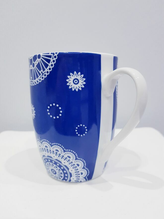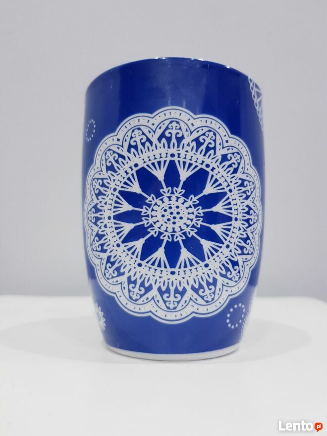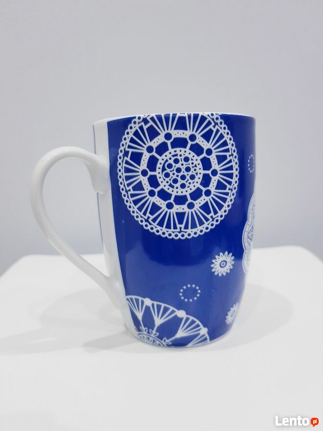 Przedmiotem sprzedaży jest ceramiczny kubek w chabrowym kolorze z imitacją haftowanym serwetek.Środek kubeczka biały.