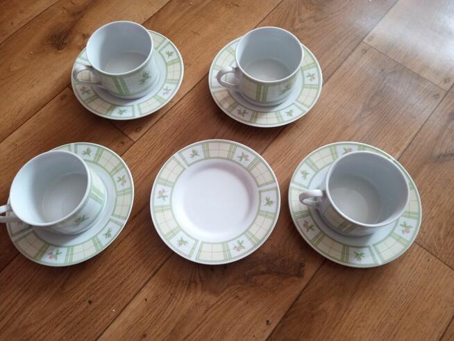 Porcelana Royal Heritange Rose Garden to Niemiecki zestaw czterech kubków/filiżanek oraz pięciu spodków porcelanowych z ...