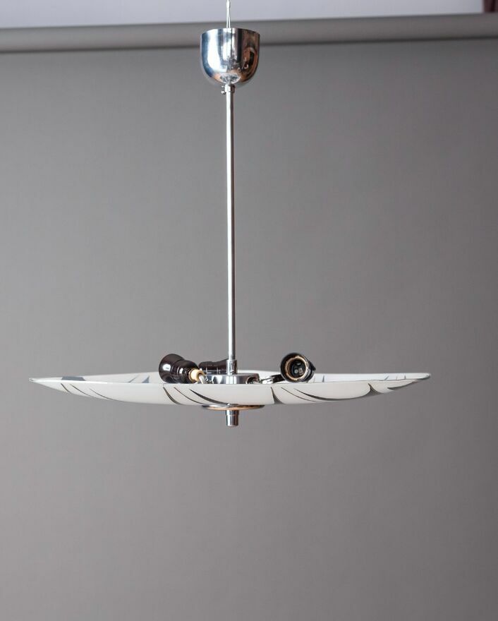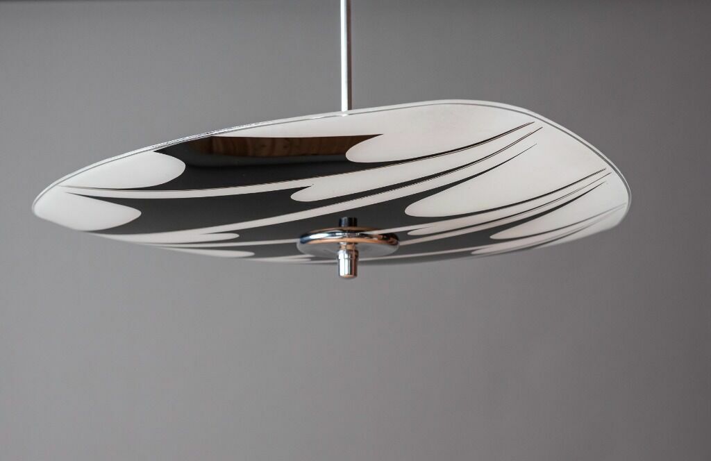 Zapraszamy do zakupu oryginalnego egzemplarza lampy wiszącej pochodzącej z okresu lat 60 ubiegłego wieku typ 1103 (Nr ew. 146). Kraj pochodzenia - Czechosłowacja. Producent - Spółdzielnia NAPAKO - słynna czeska firma produkująca oświetlenie, której historia sięga roku 1919, znana z wysokiej jakości oświetlenia, w tym lamp biurkowych, podłogowych, stołowych. Prezentowana lampa została poddana pieczołowitej, całkowitej renowacji. Elementy konstrukcji zostały gruntownie oczyszczone nadając im pierwotnego, trwałego blasku. Wymieniona w całości na nową instalacja elektryczna umożliwia włączenie 1 lub 3 punktów świetlnych. Wszystkie elementy - w tym klosz i oprawy - oryginalne. Klosz szklany, w kolorze białym z niebanalnym, charakterystycznym dla tego typu lamp wzorem . Oprawy na żarówki - 3 x E27. Wymiary: wys. 50 cm, szer. 50 cm. Dostępne dwa egzemplarze. Podana cena dotyczy jednej sztuki. Istnieje możliwość dostosowania wysokości lampy do indywidualnych oczekiwań nabywcy.Unikalny design gwarantuje wyjątkowy, niepowtarzalny efekt wizualny. Styl New Look charakterystyczny dla lat 50/60 XXw.