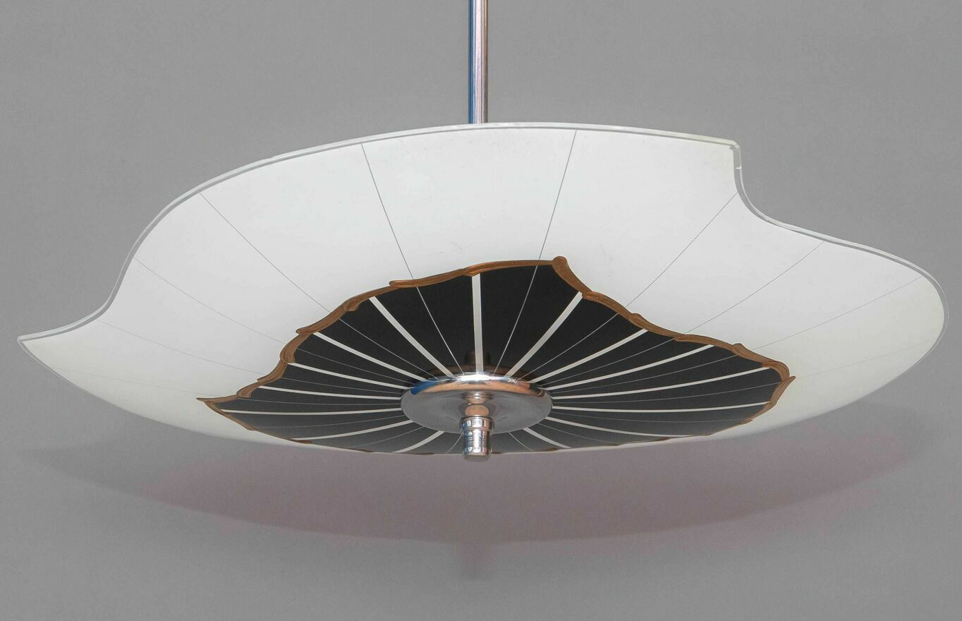 Lampa w stylu pop-art z połączeniem elementów vintage i mid-century pochodząca z okresu lat 60 ubiegłego wieku typ 1103 (Nr ew. 714). Kraj pochodzenia - Czechosłowacja. Producent - Spółdzielnia NAPAKO - słynna czeska firma produkująca oświetlenie, której historia sięga roku 1919, znana z wysokiej jakości oświetlenia, w tym lamp biurkowych, podłogowych, stołowych. Prezentowana lampa przeszła pieczołowicie wykonaną, całkowitą renowację. Elementy aluminiowe konstrukcji zostały poddane zabiegom oczyszczenia i polerowania dzięki czemu odzyskały pierwotny blask. Wymieniona w całości na nową instalacja elektryczna umożliwia włączenie 1 lub 3 punktów świetlnych. Wszystkie elementy - w tym klosz i oprawy - oryginalne. Szklany klosz lampy posiada charakterystyczny wzór przypominający wachlarz w kolorach czarnym i brązowo-złotym. Całość oprawiona w białą obudowę, nadającą jej elegancki i dostojny wygląd.Zachowana oryginalna sygnatura pochodzenia lampy. Oprawy na żarówki - 3 x E27. Wymiary: wys. 75 cm, szer. 58 cm. Istnieje możliwość dostosowania wysokości lampy do indywidualnych oczekiwań nabywcy lub warunków wynikających z charakteru pomieszczenia.
