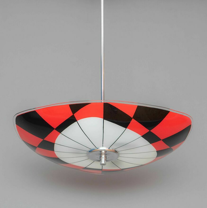 Zapraszam do zakupu oryginalnego egzemplarza lampy wiszącej pochodzącej z okresu lat 60 ubiegłego wieku typ 1103 (Nr ew. 28). Kraj pochodzenia - Czechosłowacja. Producent - Spółdzielnia NAPAKO - słynna czeska firma produkująca oświetlenie, której historia sięga roku 1919, znana z wysokiej jakości oświetlenia, w tym lamp biurkowych, podłogowych, stołowych. Prezentowana lampa została poddana pieczołowitej, całkowitej renowacji. Aluminiowe elementy konstrukcji zostały gruntownie oczyszczone nadając im pierwotnego, trwałego blasku. Zachowana oryginalna sygnatura pochodzenia lampy. Wymieniona w całości na nową instalacja elektryczna umożliwia włączenie 1 lub 3 punktów świetlnych. Wszystkie elementy - w tym klosz i oprawy - oryginalne. Klosz szklany, w kolorach czerwieni, bieli i czerni z niebanalnym wzorem. Oprawy na żarówki - 3 x E27.Unikalny design gwarantuje wyjątkowy, niepowtarzalny efekt wizualny. Styl New Look charakterystyczny dla lat 50/60 XXw. Wymiary lampy: szerokość - 48 cm, wysokość 76 cm. Wysokość lampy może być dostosowana do indywidualnych oczekiwań nabywcy.