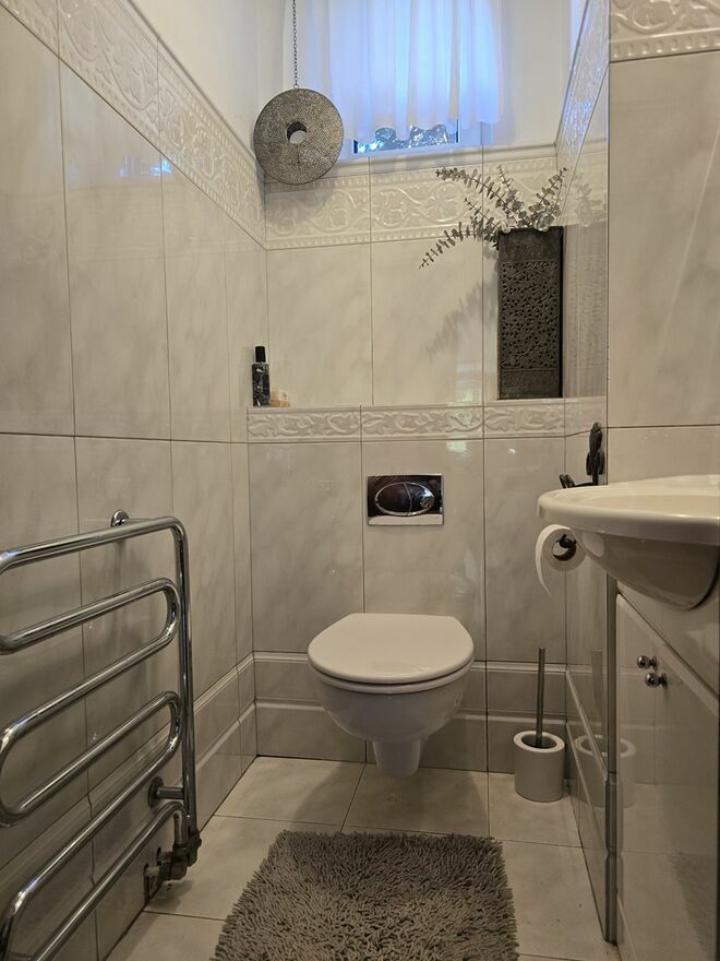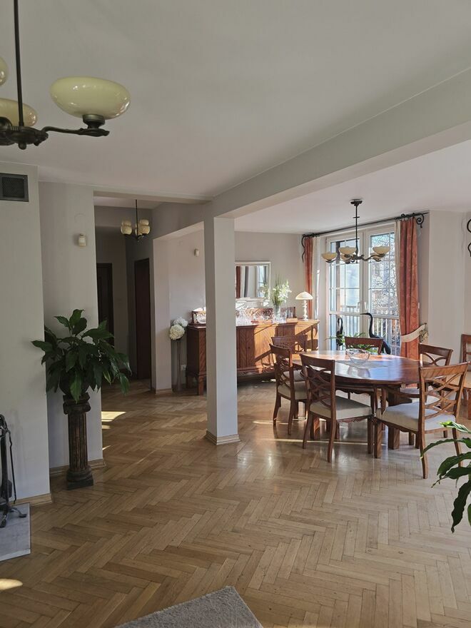 W pokojach na podłodze parkiet, w kuchni i przedpokoju płytki, ściany malowane. Łazienki w płytkach.