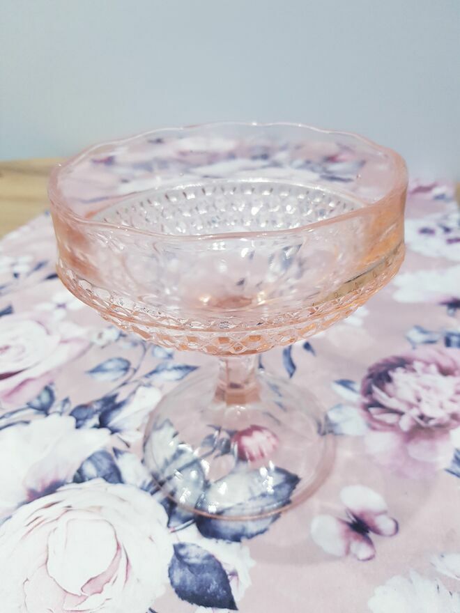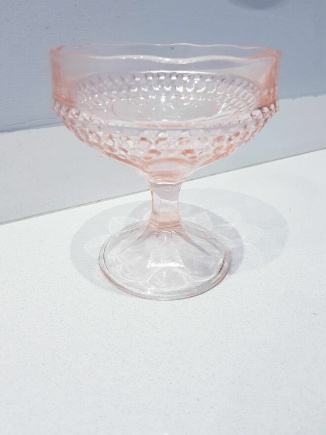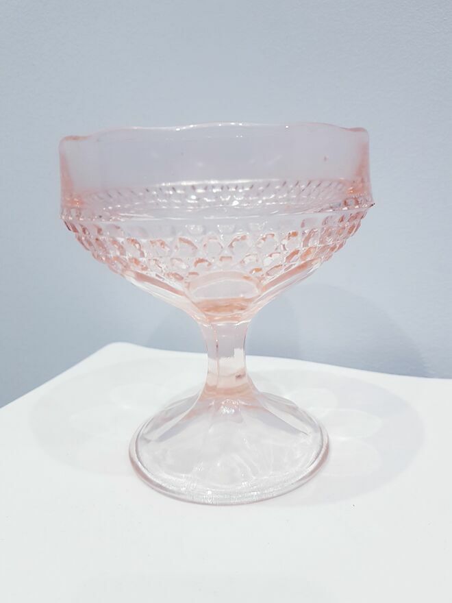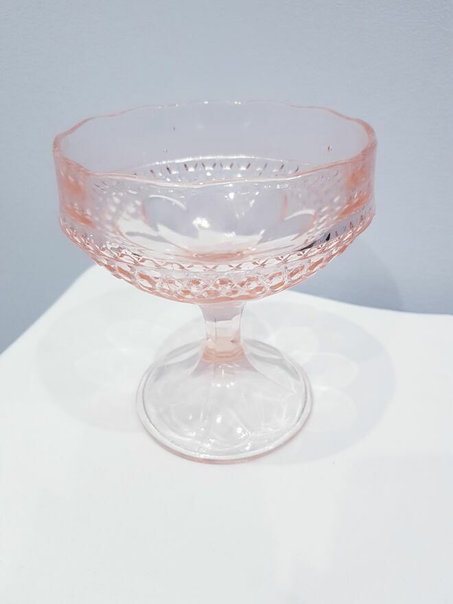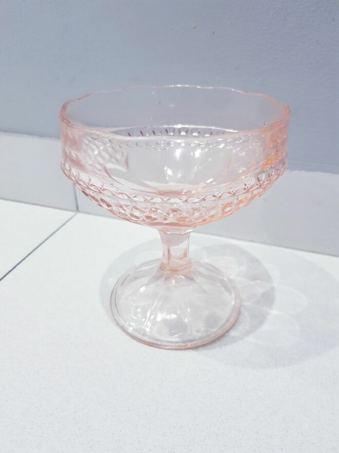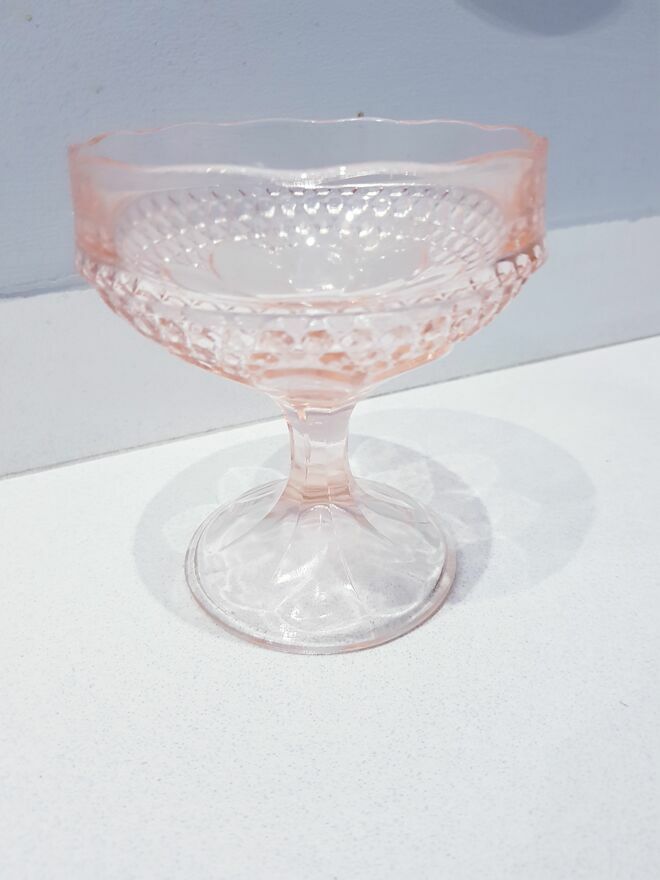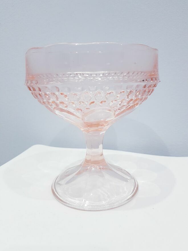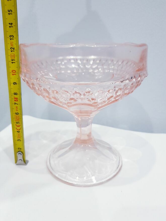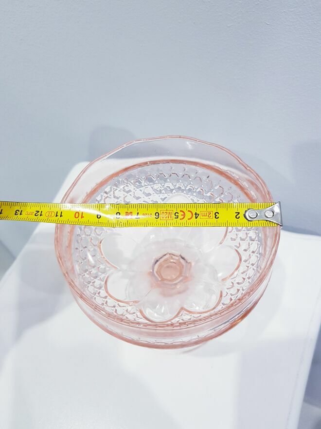 Przedmiotem sprzedaży jest zabytkowa szklana cukiernica, bombonierka na stopie z okresu prl-u w łososiowo-różowym kolorze.Wyprodukowana przez Hutę Szkła Gospodarczego "Ząbkowice" w Dąbrowie Górniczej w latach 70 XX w.