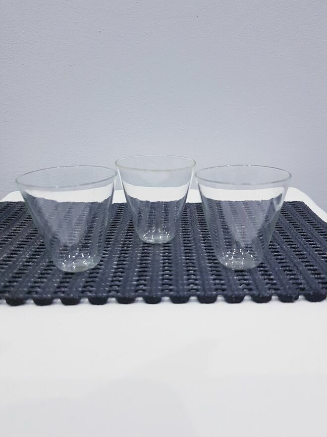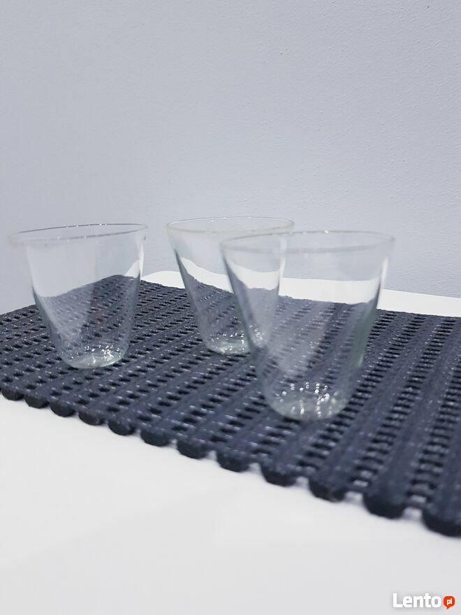 Przedmiotem sprzedaży jest zestaw starych stożkowych kieliszków do wódki.Kieliszki o dodść specyficznym kształcie-stożkowe ale bez nóżki. Wykonane z bardzo cieniutkiego szkła. Dlatego też są bardzo lekkie. Niestety, nie umiem określić ile mogą mieć lat. Zostały znalezione w starym domu na strychu. Udało się odnaleźć tylko 3 sztuki ale dla konesera 3 sztuki też wystarczą.
