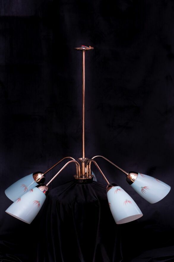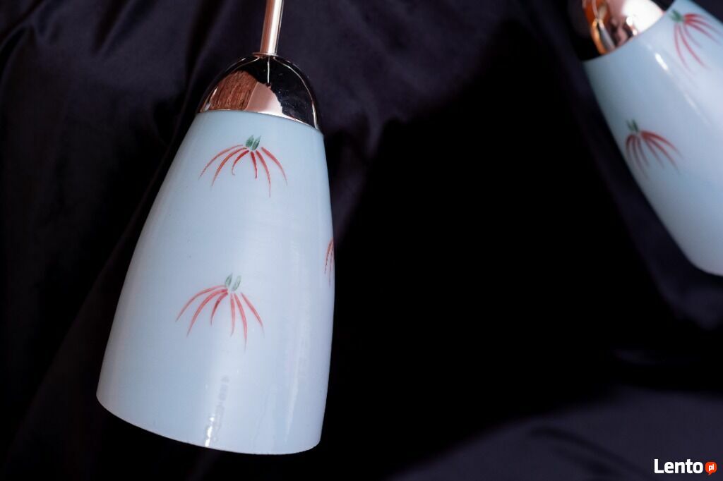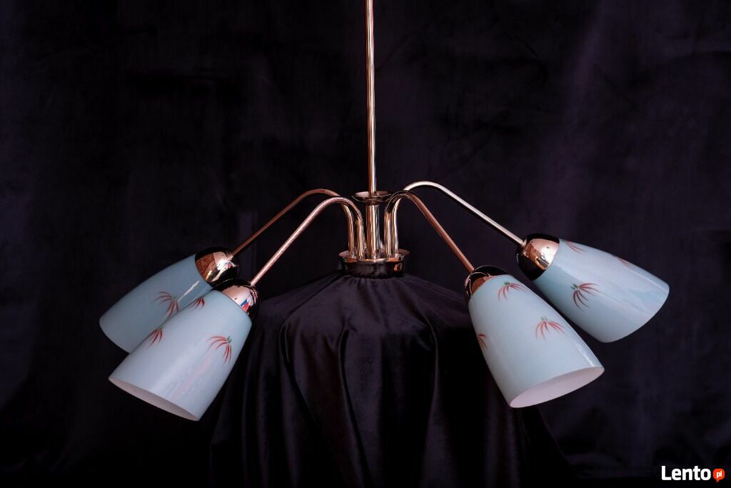 Przedmiotem oferty jest 5-ramienny żyrandol pochodzący z okresu lat 60 ubiegłego wieku (Nr ew. 26). Kraj pochodzenia - Polska. Producent - Spółdzielnia Pracy ELMED Zabrze. Żyrandol został poddany pieczołowitej, profesjonalnej i całkowitej renowacji. Elementy metalowe konstrukcji zostały gruntownie oczyszczone, stara warstwa niklu została dokładnie usunięta a na jej miejsce metodą galwanizacji została nałożona nowa powłoka. Nowa Instalacja elektryczna umożliwiająca włączenie żarówek w układzie 2/3/5. Stan po renowacji idealny. Wszystkie elementy oryginalne. Klosze szklane ze szkła warstwowego, ręcznie malowane. Oprawy na żarówki - 5 x E27. Przedmiot o wartości kolekcjonerskiej z sygnaturą.Niepowtarzalny design gwarantuje wyjątkowy efekt wizualny. Pomimo upływu czasu doskonale komponuje się z wystrojem dzisiejszych pomieszczeń. Styl New Look charakterystyczny dla lat pochodzenia przedmiotu, potocznie określanym w Polsce okresem PRL.