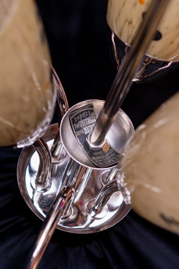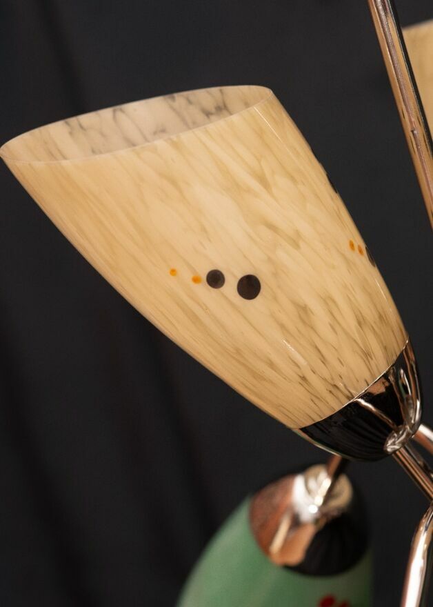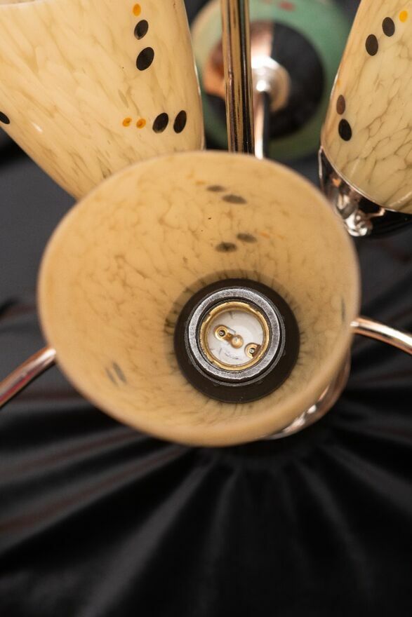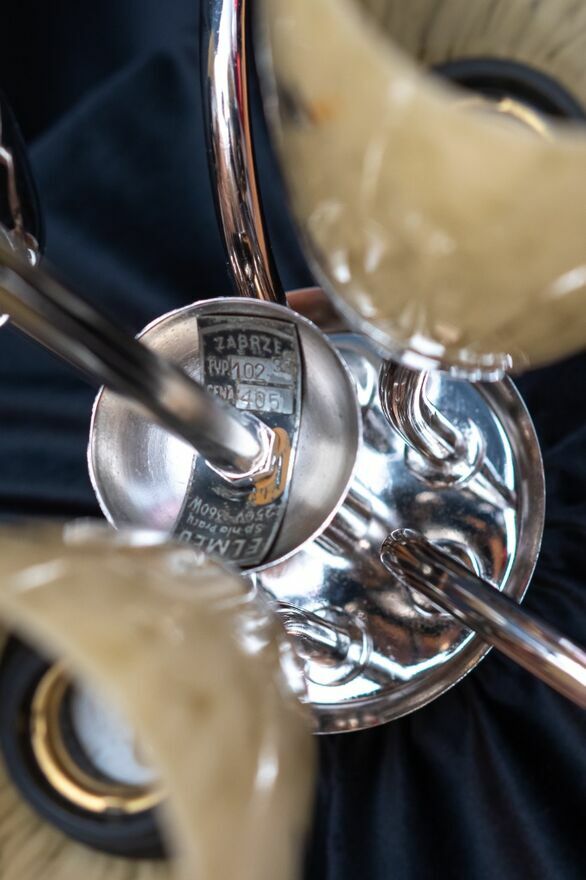 Zapraszamy do zakupu wyjątkowego egzemplarza żyrandola 6-ramiennego pochodzącego z okresu lat 60 ubiegłego wieku (nr ew. 458). Kraj pochodzenia - Polska. Producent - Spółdzielnia Pracy ELMED Zabrze typ 102. Żyrandol został poddany pieczołowitej, całkowitej renowacji. Elementy konstrukcji zostały gruntownie oczyszczone i poddane powtórnej galwanizacji poprzez nałożenie nowej powłoki niklu. Instalacja elektryczna została wymieniona na nową umożliwiająca włączenie 3 lub 6 punktów świetlnych. Wszystkie elementy oryginalne. Klosze szklane ze szkła warstwowego, ręcznie malowane. Oprawy na żarówki - 6 x E27. Przedmiot o wartości kolekcjonerskiej z sygnaturą.Niepowtarzalna stylistyka gwarantuje wyjątkowy efekt wizualny. Styl New Look charakterystyczny dla lat 50/60 XXw. W Polsce uznawany za styl okresu PRL.