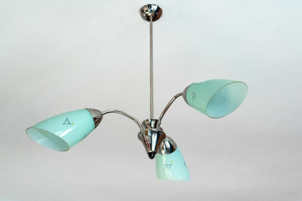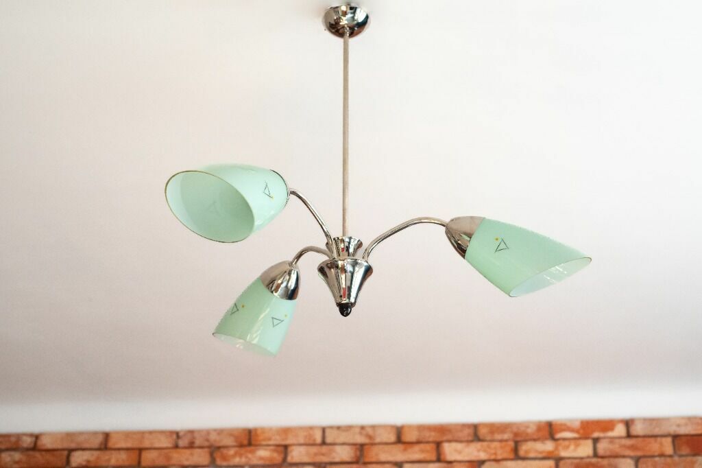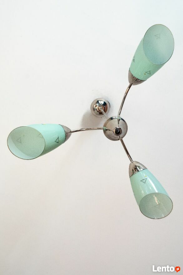 Oferta skierowana do miłośników polskiego designu okresu drugiej połowy XX w. Przedmiotem sprzedaży jest 3-ramienny żyrandol pochodzący z okresu lat 60 ubiegłego wieku (Nr ew. 528). Kraj pochodzenia - Polska. Producent - J. Kasiński Poznań. Żyrandol został poddany całkowitej, profesjonalnej renowacji. Elementy metalowe konstrukcji zostały gruntownie oczyszczone, stara warstwa niklu została dokładnie usunięta a na jej miejsce metodą galwanizacji została nałożona nowa powłoka. Nowa Instalacja elektryczna umożliwia włączenie żarówek w układzie 1/2/3. Stan po renowacji idealny. Wszystkie elementy oryginalne. Klosze szklane (szkło warstwowe), ręcznie malowane. Oprawy na żarówki - 3 x E27. Możliwość dostosowania długości żyrandola do indywidualnych potrzeb nabywcy. Przedmiot o wartości kolekcjonerskiej z sygnaturą.Niepowtarzalny design gwarantuje wyjątkowy efekt wizualny. Styl New Look charakterystyczny dla lat pochodzenia przedmiotu, potocznie określanym w Polsce okresem PRL. Prezentowany żyrandol doskonale komponuje się z wystrojem dzisiejszych pomieszczeń stanowiąc wyjątkowy dodatek.
