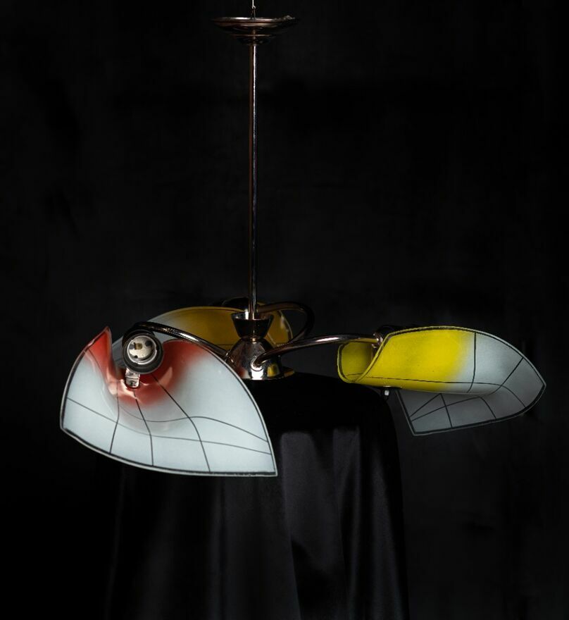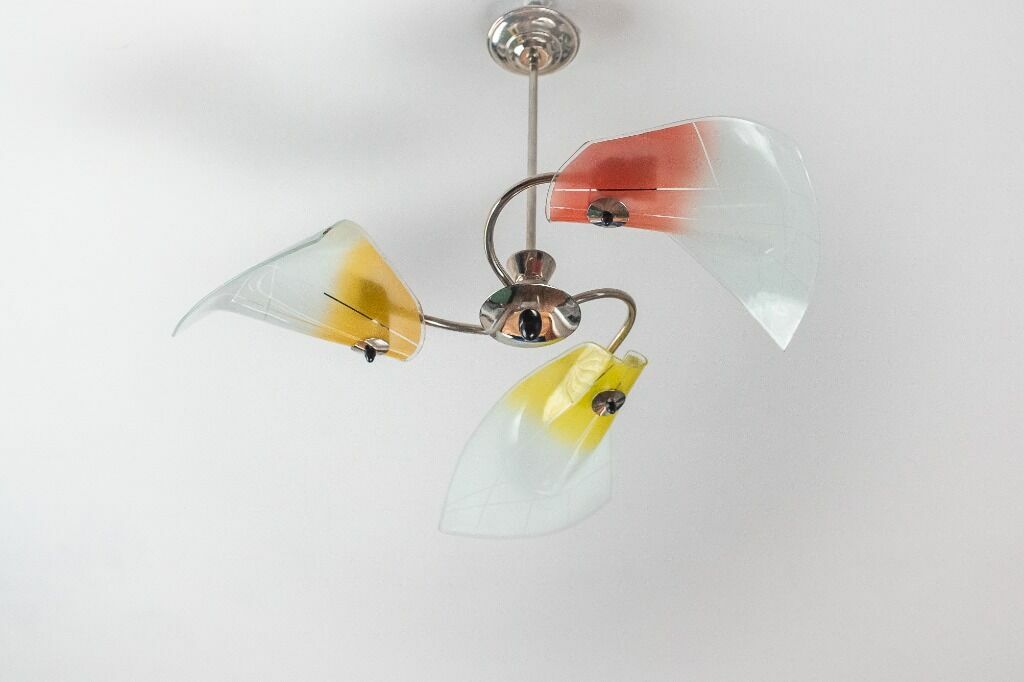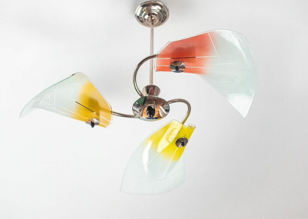 Zapraszam serdecznie do zakupu 3-ramiennego żyrandola pochodzącego z okresu lat 60/70 ubiegłego wieku (Nr ew. 112). Kraj pochodzenia - Polska. Żyrandol został poddany pieczołowitej, profesjonalnej i całkowitej renowacji. Elementy metalowe konstrukcji zostały gruntownie oczyszczone, stara warstwa niklu została dokładnie usunięta a na jej miejsce metodą galwanizacji została nałożona nowa powłoka. Nowa Instalacja elektryczna. Stan po renowacji idealny. Wszystkie elementy oryginalne. Klosze szklane, ręcznie malowane. Oprawy na żarówki - 3 x E27.Niepowtarzalny design gwarantuje wyjątkowy efekt wizualny. Styl New Look charakterystyczny dla lat pochodzenia przedmiotu, potocznie określanym w Polsce okresem PRL. Mimo upływu czasu doskonale komponuje się z wystrojem dzisiejszych pomieszczeń.