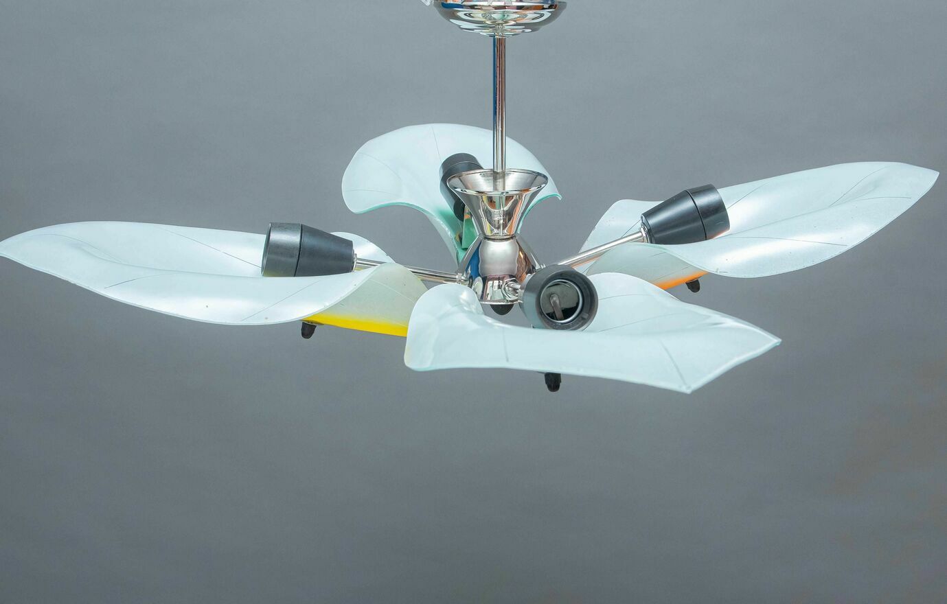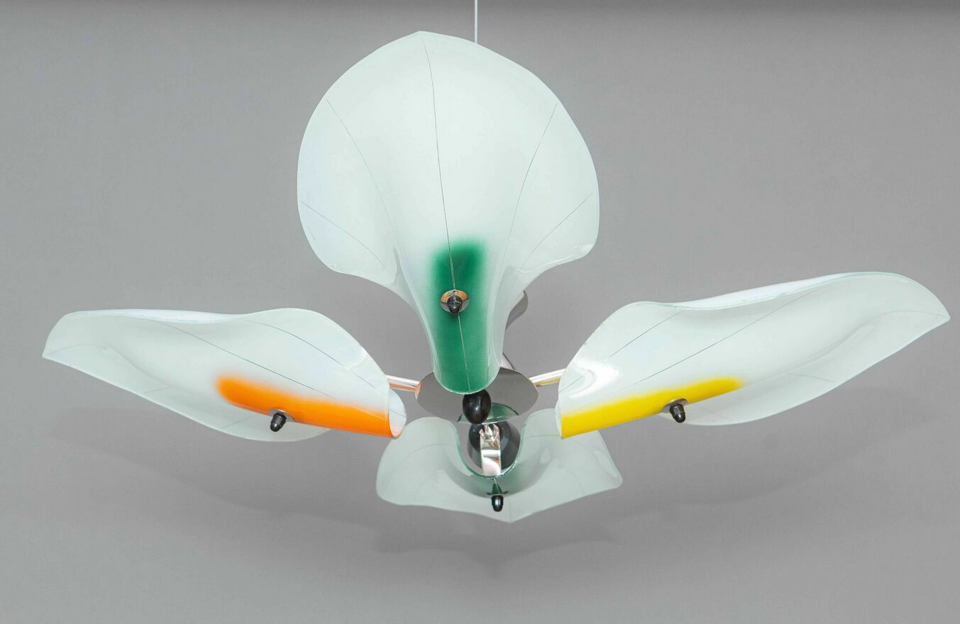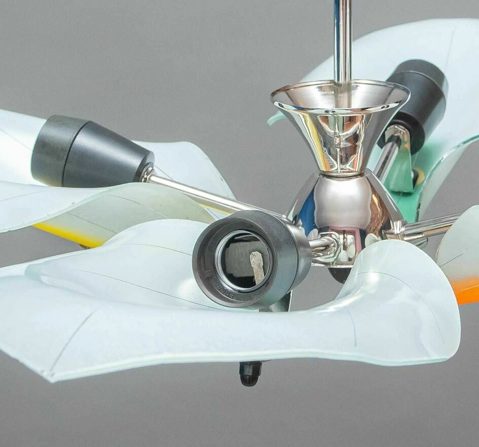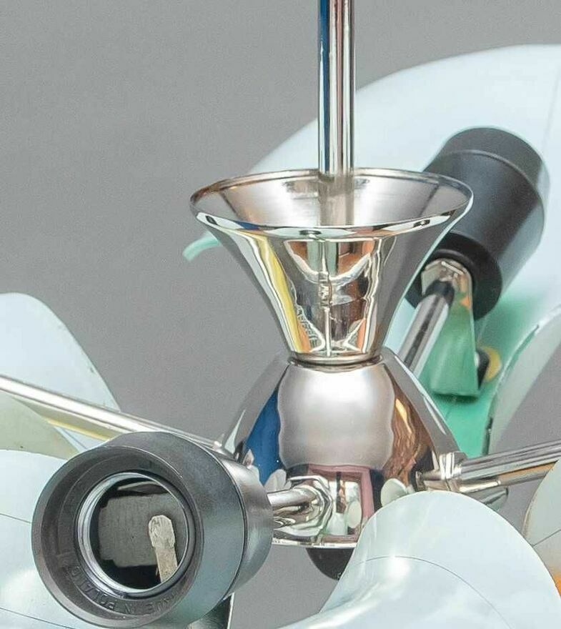 Oferta skierowana do miłośników polskiego designu okresu drugiej połowy XX w. Przedmiotem sprzedaży jest wyjątkowo ciekawy egzemplarz 4-ramiennego żyrandola pochodzącego z okresu lat 60 ubiegłego wieku (Nr ew. 245). Kraj pochodzenia - Polska. Żyrandol przeszedł całkowitą, profesjonalną renowację polegającą m.in. na całkowitym oczyszczeniu części metalowej. W kolejnym kroku na oczyszczone powierzchnie została nałożona metodą galwanizacji nowa powłoka niklu dzięki czemu żyrandol odzyskał pierwotny blask. Nowa Instalacja elektryczna umożliwia włączenie żarówek w układzie 1/2/3. Stan po renowacji idealny. Wszystkie elementy oryginalne. Klosze szklane, ręcznie malowane w kształcie lilii. Oprawy na żarówki - 4 x E27. Możliwość dostosowania długości żyrandola do indywidualnych potrzeb pomieszczenia, w którym miałby się prezentować.Niepowtarzalny design przedmiotu ożywi każdą przestrzeń. Styl New Look charakterystyczny dla lat pochodzenia przedmiotu, potocznie określanym w Polsce okresem PRL. Prezentowany żyrandol doskonale komponuje się z wystrojem dzisiejszych pomieszczeń stanowiąc wyjątkowy dodatek.