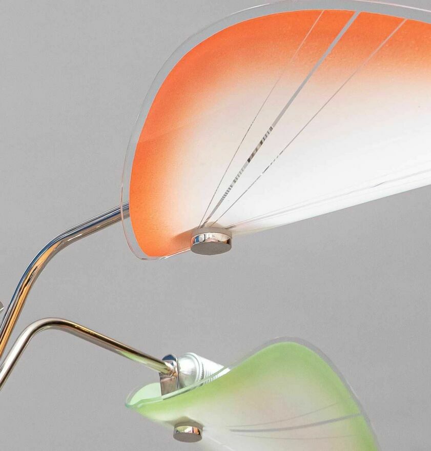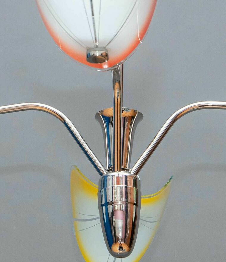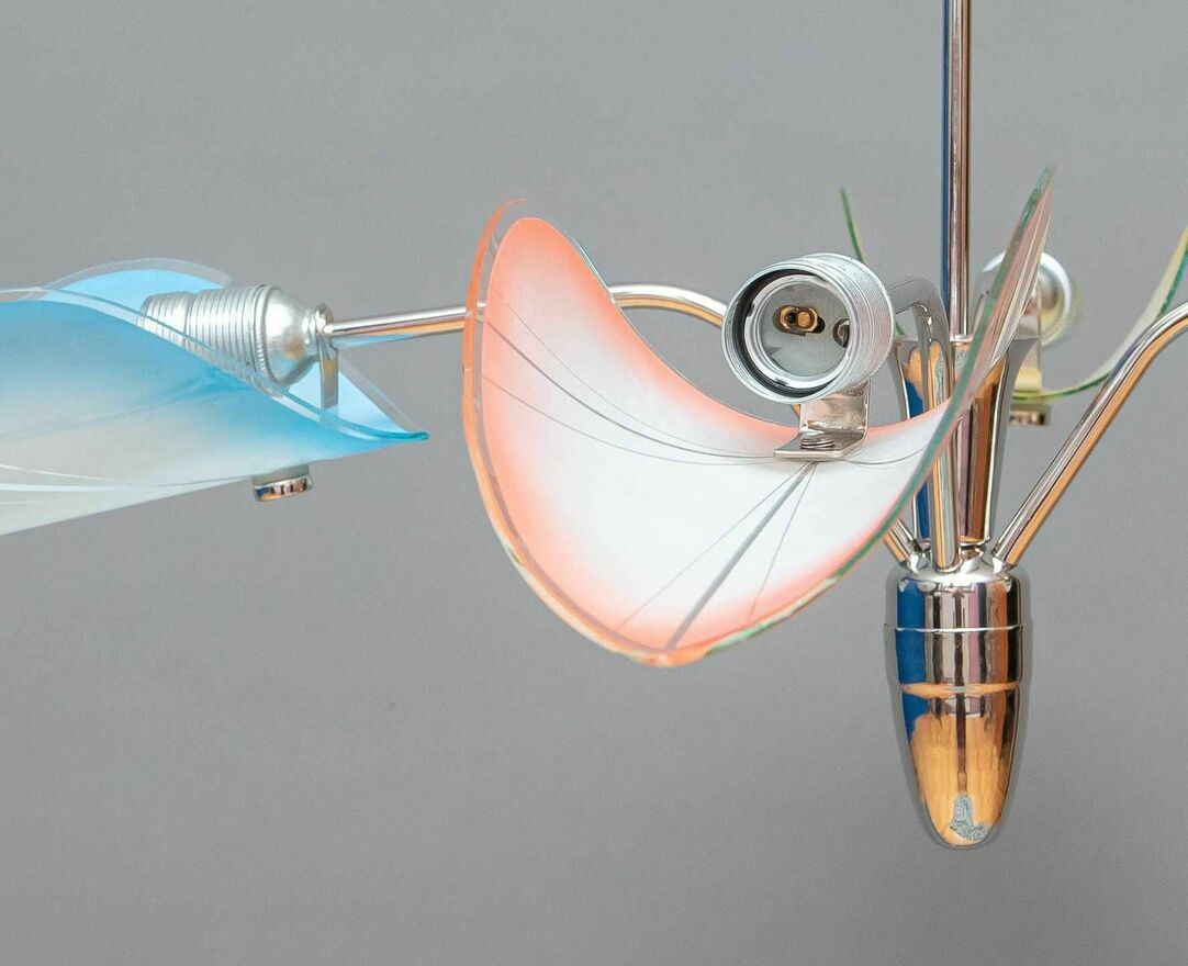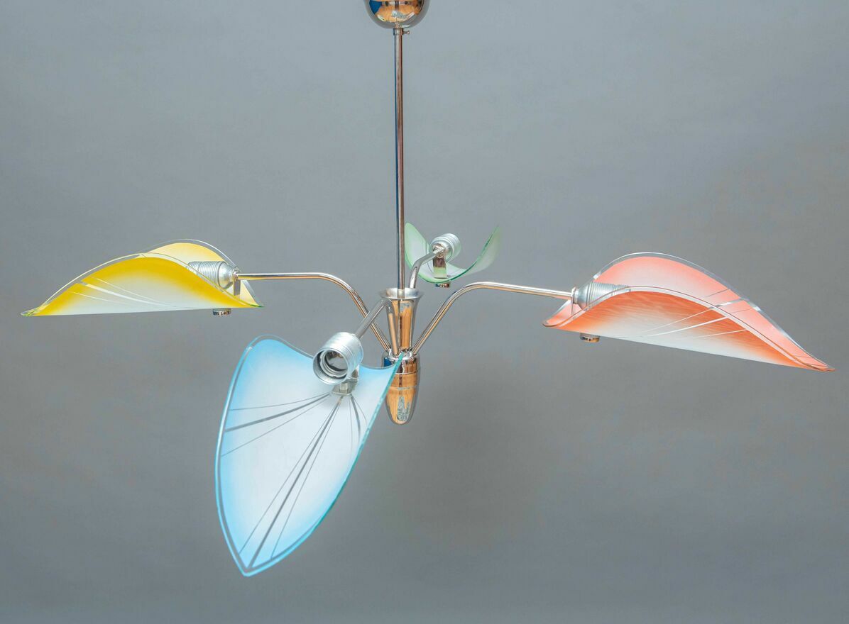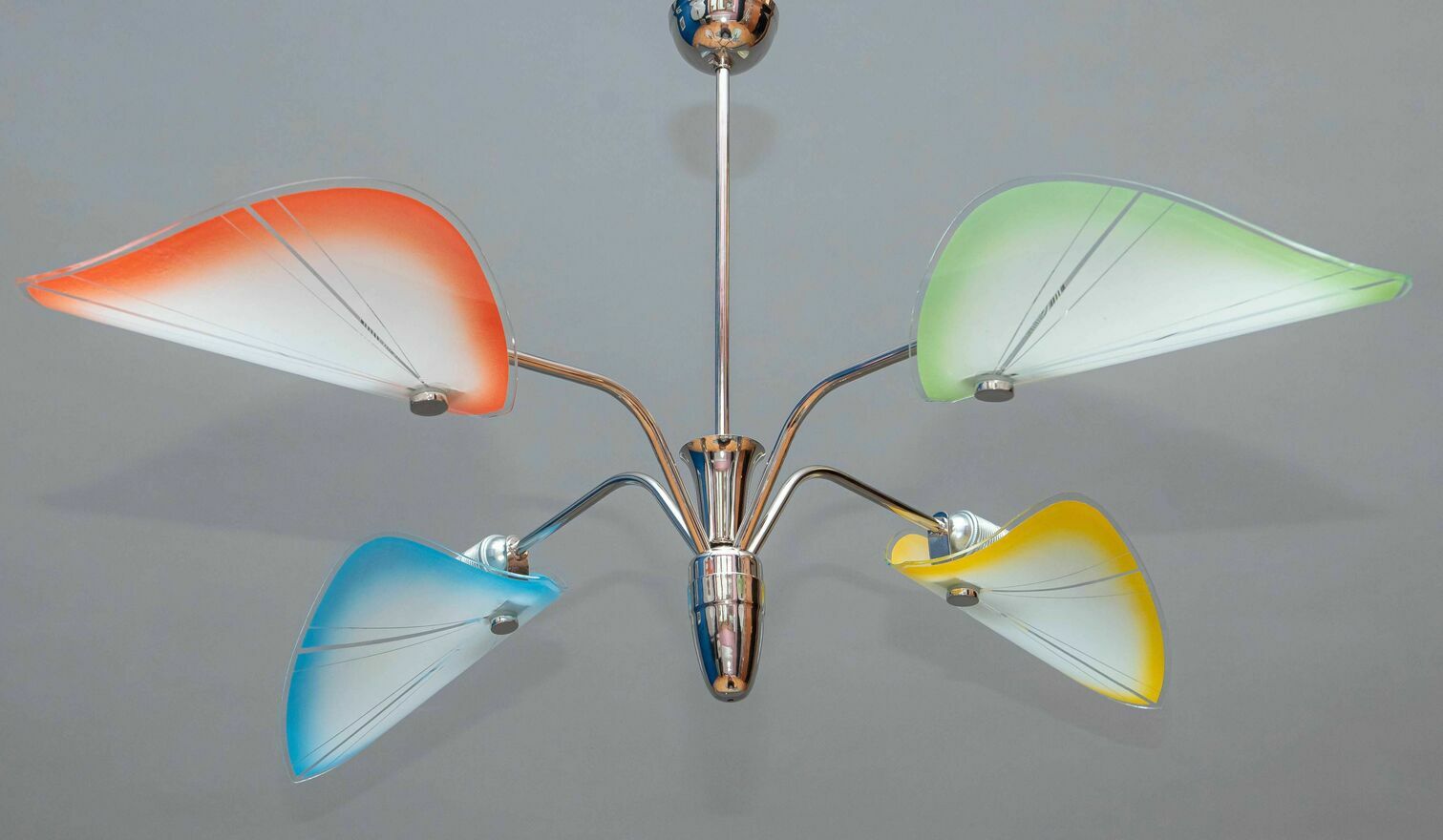 Przedmiotem oferty jest efektowny w swoim projekcie 4-ramienny żyrandol pochodzący z okresu lat 60/70 ubiegłego wieku (Nr ew. 355). Kraj pochodzenia - Polska. Żyrandol został poddany profesjonalnej i wyjątkowo pieczołowitej renowacji. Elementy metalowe konstrukcji zostały całkowicie oczyszczone z warstwy starego niklu a na jej miejsce metodą galwanizacji została nałożona nowa powłoka. Nowa Instalacja elektryczna umożliwiająca włączenie 2 lub 4 punktów świetlnych. Stan po renowacji idealny. Wszystkie elementy oryginalne. Klosze szklane, ręcznie malowane, w kształcie liści. Oprawy na żarówki - 4 x E27.Niepowtarzalny design gwarantuje wyjątkowy efekt wizualny. Styl New Look charakterystyczny dla lat pochodzenia przedmiotu, potocznie określanym w Polsce okresem PRL. Mimo upływu czasu doskonale komponuje się z wystrojem dzisiejszych pomieszczeń.