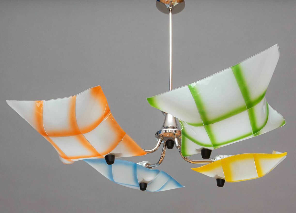 Zapraszam do zakupu 4-ramiennego żyrandola pochodzącego z okresu lat 70 ubiegłego wieku (Nr ew. 83). Kraj pochodzenia - Polska. Żyrandol po całkowitej, profesjonalnej renowacji. Elementy metalowe konstrukcji po gruntownym oczyszczeniu zostały pokryte metodą galwanizacji nową powłoką niklu dzięki czemu odzyskały pierwotny blask. Nowa Instalacja elektryczna umożliwia włączenie żarówek w układzie 2/2/4. Stan po renowacji idealny. Wszystkie elementy oryginalne. Niepowtarzalny design kloszy gwarantuje wyjątkowy efekt wizualny. Oprawy na żarówki - 4 x E27. Możliwość dostosowania wysokości żyrandola do indywidualnych potrzeb nabywcy.Styl New Look charakterystyczny dla lat pochodzenia przedmiotu, potocznie określanym w Polsce okresem PRL. Mimo upływu czasu doskonale komponuje się z wystrojem dzisiejszych pomieszczeń.